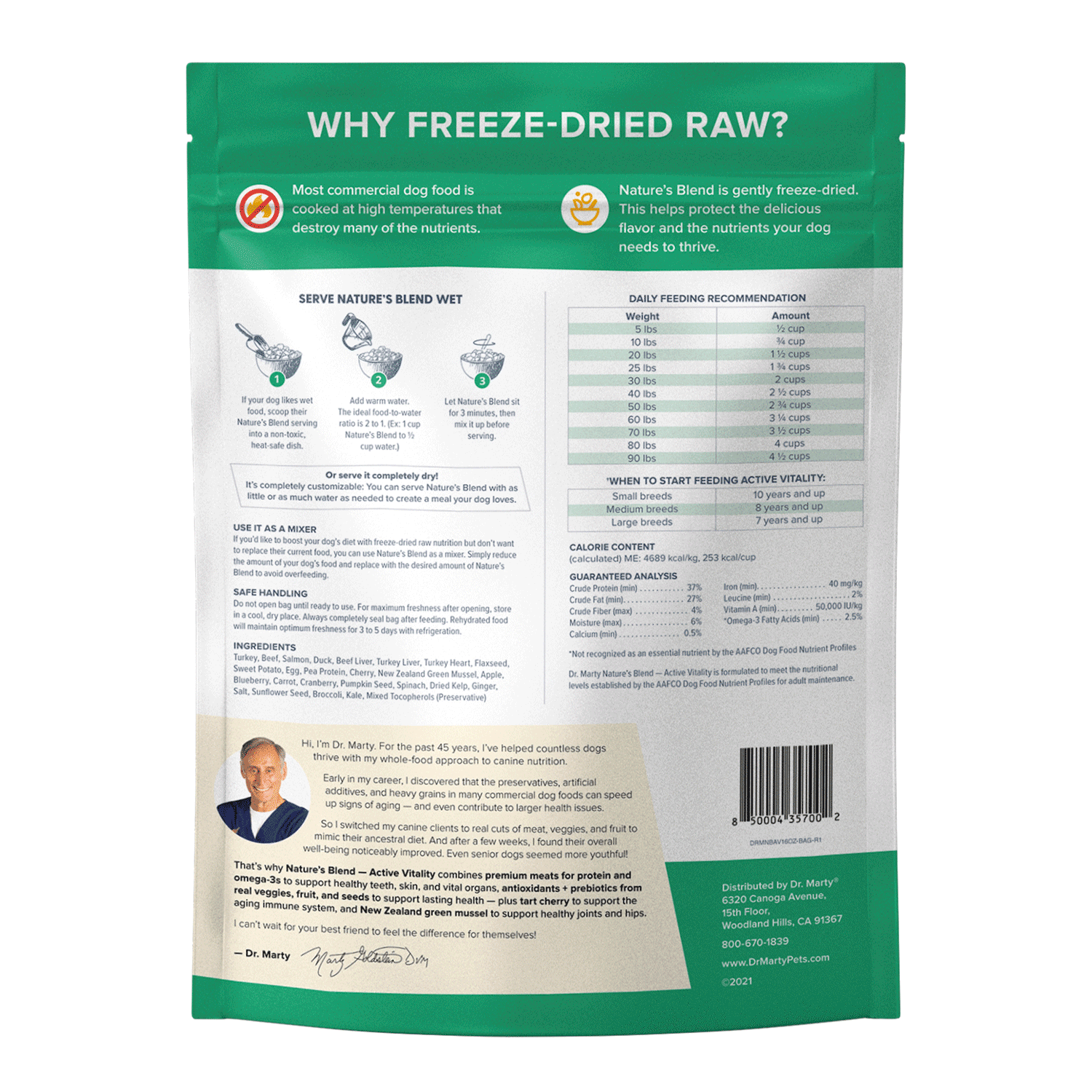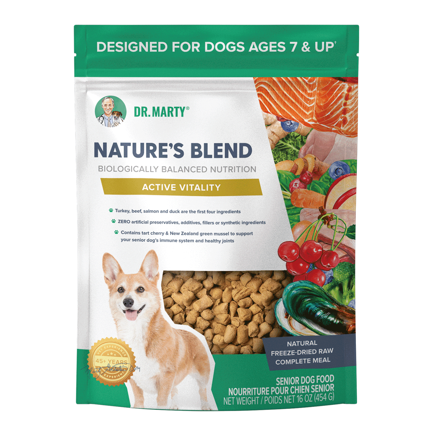 Dr. Marty Nature’s Blend – Active Vitality is a premium freeze-dried raw food designed to help dogs ages 7+ thrive. It combines premium meat, vegetables, fruit, and key superfoods to combat common signs of canine aging and support your dog’s easy digestion, healthy immune system, limber joints, and playful energy… with ZERO artificial preservatives, or fillers.