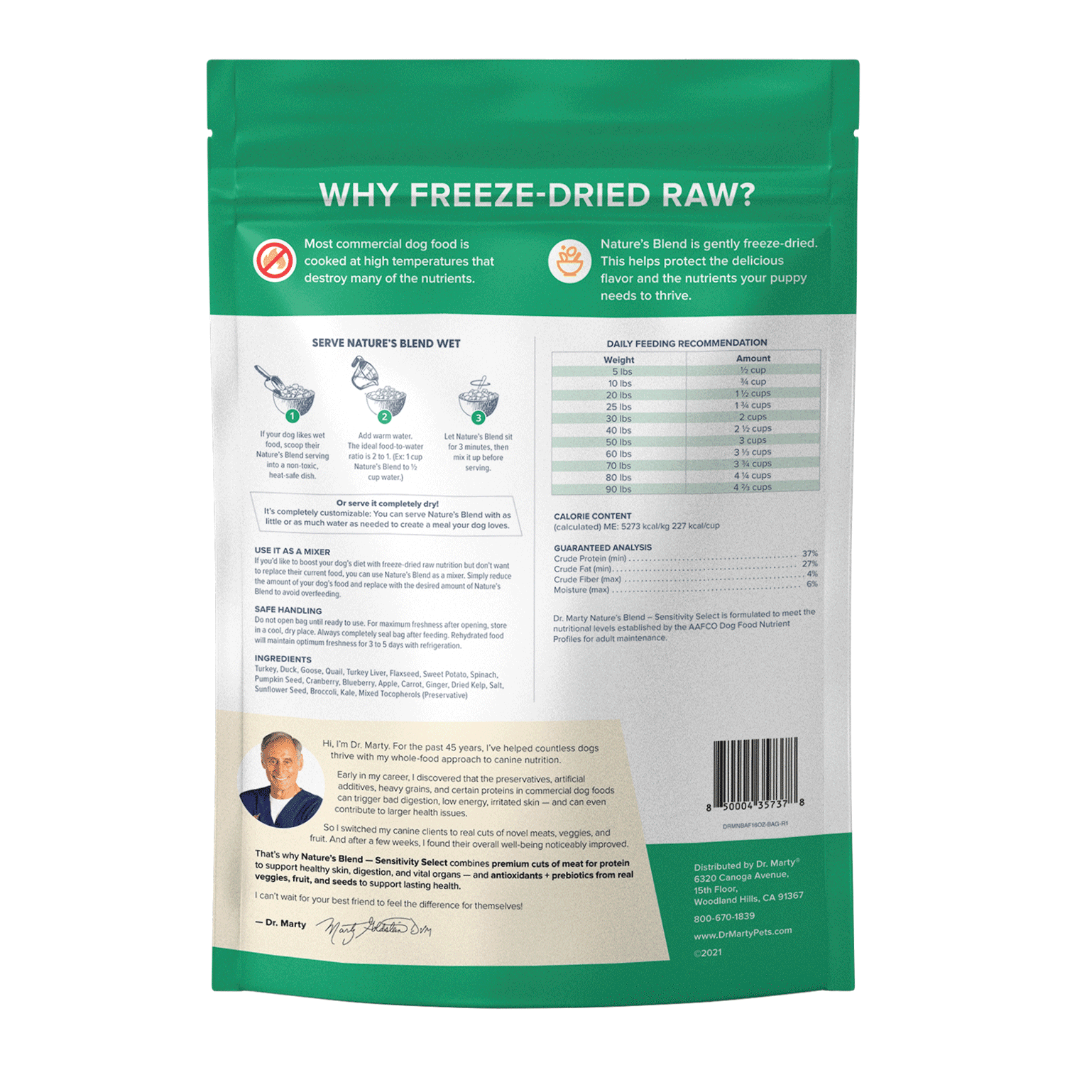 Dr. Marty Nature’s Blend – Sensitivity Select is a premium freeze-dried raw food designed specifically for dogs with food sensitivities. It combines premium poultry, seeds, veggies, and fruit to support your dog’s easy digestion, healthy skin, youthful energy, and healthy joints… with ZERO common “problem foods,” artificial preservatives, or fillers.