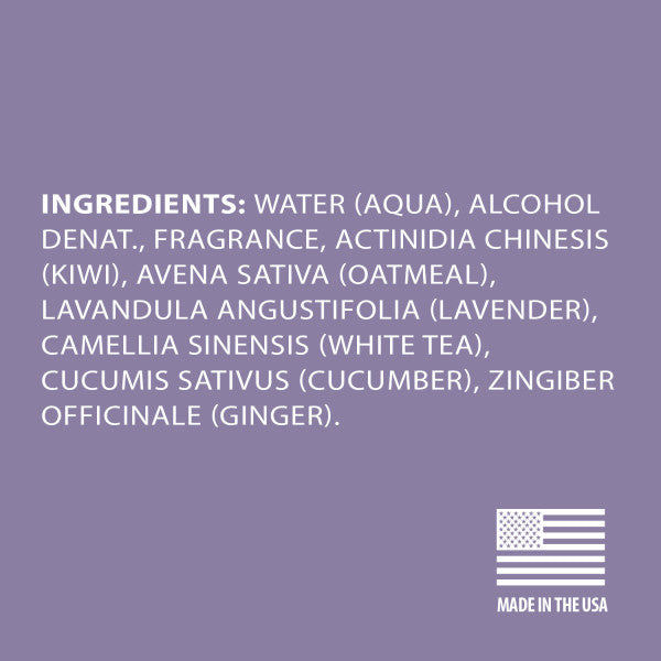 Water (Aqua), Alcohol Denat., Fragrance, Actinidia Chinesis (Kiwi), Avena Sativa (Oatmeal), Lavandula Angustifolia (Lavender), Camellia Sinensis (White Tea), Cucumis Sativus (Cucumber), Zingiber Officinale (Ginger)