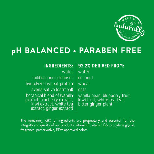Water, Mild Coconut Cleanser, Hydrolyzed Wheat Protein, Avena Sativa (oatmeal), Botanical Blend of (vanilla extract, blueberry extract, kiwi extract, white tea extract, ginger extract)